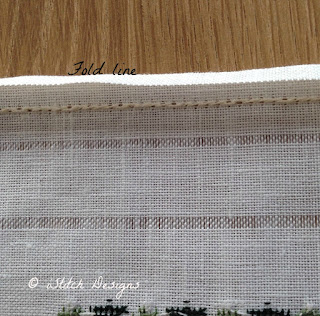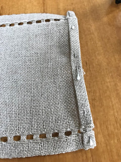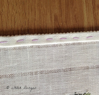 Iron the whole thing and then cut out the squares leaving a centimetre (slightly under 1/2") margin. From the skirtex or card cut squares to fit inside your stitching - slightly inside the outside stitch. Fold the stitched piece around the card and lace. Repeat for all six squares.