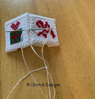 Close up the open sides, lose any hanging threads inside the cube. You will now have a finished cube ornament. These were two that I, and my granddaughter Megan, finished yesterday. Meg stitched on 30ct Brussels linen and mine is done on a 35ct Brussels linen.