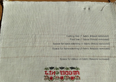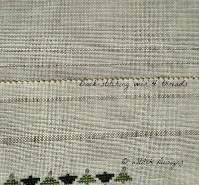 Take the first two squares and leaving a hanging thread of about 10cm (4") ladder stitch them together through the linen thread between the holes made by the 4-sided stitches. If you arrive at a spot where there is a hanging thread tie them together and lose inside the cube and start with a new thread again leaving a hanging thread.